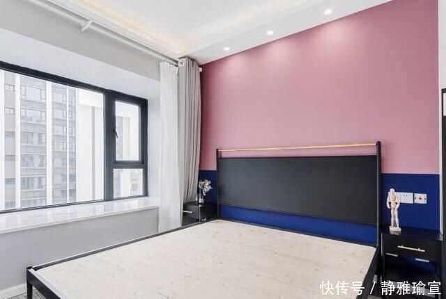 其实主卧最迷人的还是床头,粉红色与蓝色墙漆,要搭配黑色的床头,稳重大气又透露出浪漫的温馨感,看起来很时尚。而飘台挺大的,休暇时可以躺在这看书等等。